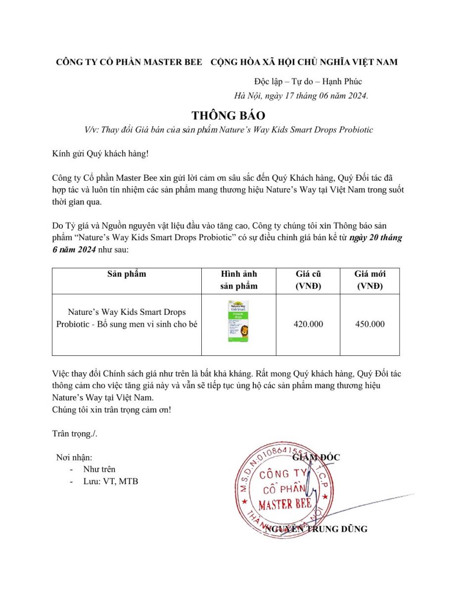 Đối với Nhà phân phối sẽ được áp dụng giá mới kể từ ngày 01-07-2024. Sự thay đổi giá này là bất khả kháng. Vì vậy, Công ty Master Bee kính mong Quý khách hàng thấu hiểu và tiếp tục ủng hộ các sản phẩm của Nature's Way.